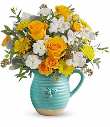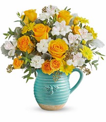 As bright and cheerful as a sunny day, Teleflora's Bee Joyful Bouquet overflows with fresh yellow and white blooms, beautifully arranged in Teleflora's Busy Bee Pitcher. Adorned with charming bee details, this delightful stoneware keepsake is sure to bring joy long after the flowers bloom.
