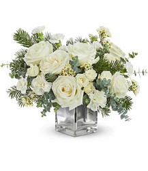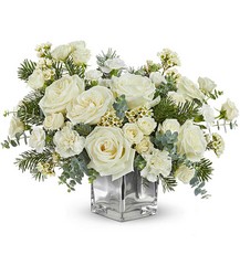 The Arctic Blooms Bouquet captures winter's serene beauty with snowy white roses, soft winter greens, and seasonal accents in a chic silver cube. A stunning Christmas or winter gift to brighten the season.